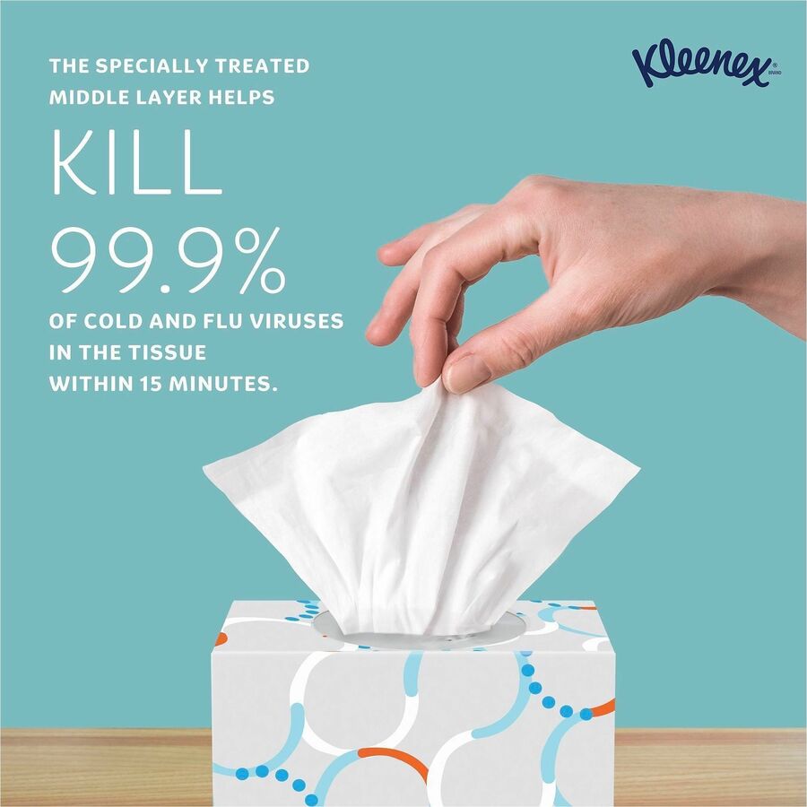 | Marketing Information | Because cold and flu viruses are often spread by hand contact, Kleenex brand has developed a tissue for your whole business. Each anti-viral tissue has three soft layers, including a moisture-activated middle layer that kills 99.9 percent of cold and flu viruses in the tissue within 15 minutes. It's virucidal against Rhinoviruses Type 1A and 2, Influenza A and B, and Respiratory Syncytial Virus. Each box comes with germ-fighting tissues, and each tissue features small blue dots on the interior layer to signal that they're antiviral. So whether you are a teacher caring for children, a commercial operator with a big staff or a business owner who cares about your employees' health, these antiviral facial tissues can be an important part of keeping your crew healthy year-round. |