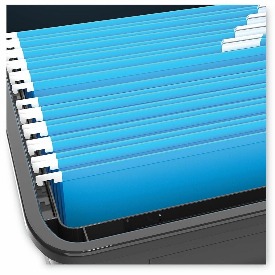 Tote storage box lets you conveniently organize your legal-size and letter-size documents in a portable design. Storage compartment offers quick access to your files and documents. Comfort grips make transportation easy and painless. |
